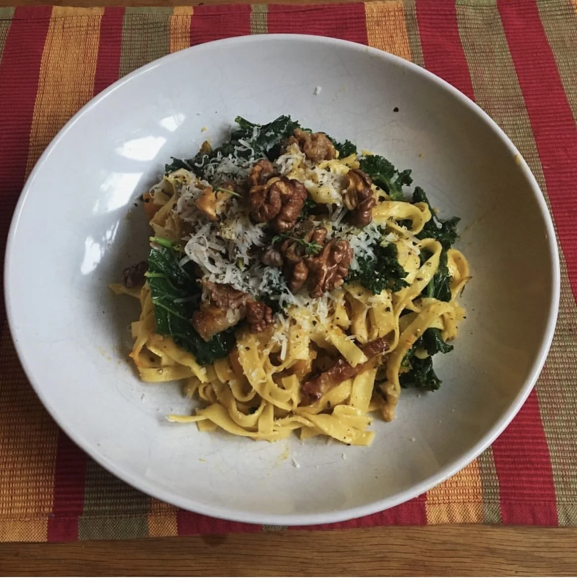 - Finish with the walnuts, a generous amount of black pepper and a little sprinkle of Parmesan